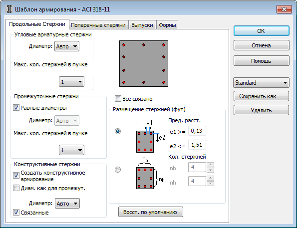 Прим.: Требования норм, касающиеся минимального коэффициента армирования поперечного сечения, относятся только к основным стержням. Конструктивные стержни будут создаваться в том случае, если нет необходимости создавать основные стержни (т. е. стержни, предназначенные для того, чтобы нести нагрузку в поперечном сечении) на данной стороне, и одновременно по условиям расстояния между стержнями (или по другим условиям норм) необходимо вставлять стержни вдоль стороны колонны. Если эта опция выключена, то все стержни поперечного сечения учитываются при его расчете.