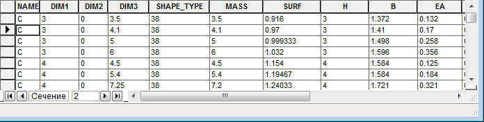 Все сечения, расположенные в выбранные базе данных сечений отображаются в нижней части окна просмотра. Следующие данные отображается для каждого сечения.