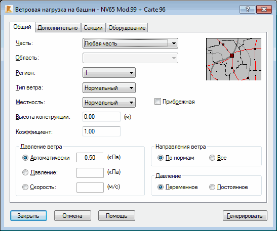 Нижняя часть диалогового окна содержит стандартные кнопки: Закрыть, Помощь, Отменить и кнопку Генерация. При нажатии на кнопку Генерация программа начинает генерировать ветровые нагрузки на заданную колонну и готовить комментарии к расчету.