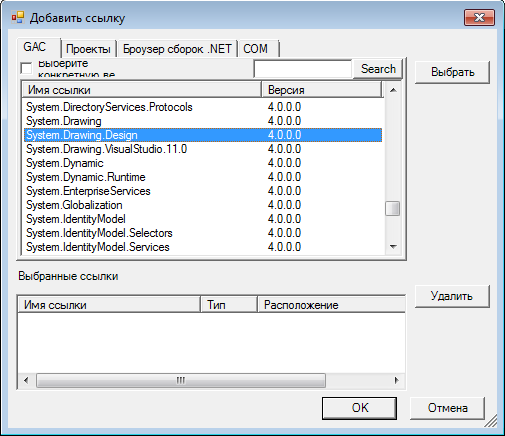 В диалоговом окне "Add Reference" найдите в списке и выберите System.Drawing и System.Windows.Forms. Выбор нескольких элементов выполняется при нажатой клавише Ctrl. Например: