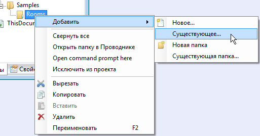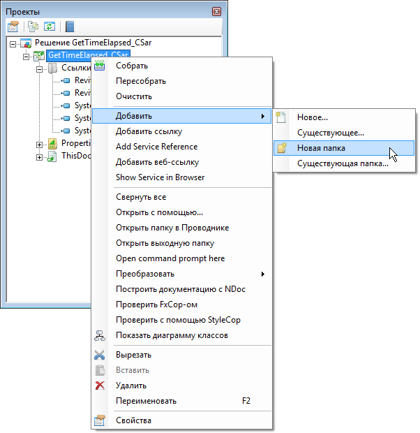 Вернитесь в среду Revit IDE. В "Проводнике проектов" (для продолжения работы над данными примером) щелкните правой кнопкой мыши на папке, созданной для макроса, и выберите в контекстном меню "Добавить"