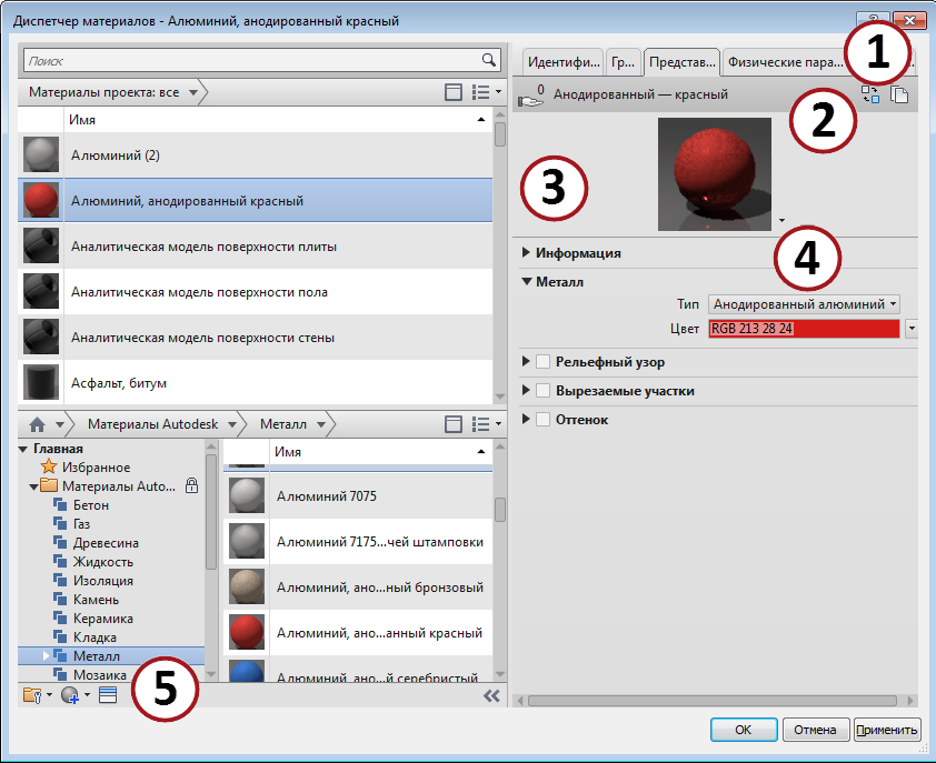 | 4 | Панель "Свойства": отображение и управление дополнительными свойствами выбранного набора характеристик. Имя и описание набора характеристик отображаются под раскрывающейся панелью "Информация". В приведенном выше примере показаны свойства металла, отображаемые (развернутые) для набора характеристик внешнего вида "Анодированный — красный". |