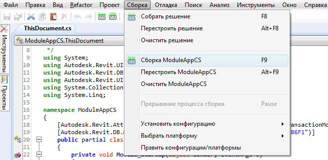 В случае правильной компоновки программы в левом нижнем углу окна Revit macro IDE будет выведено сообщение "Компоновка выполнена успешно".