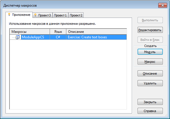 Новый модуль создается и добавляется в список в Диспетчере макросов. Теперь можно добавить один или несколько макросов.