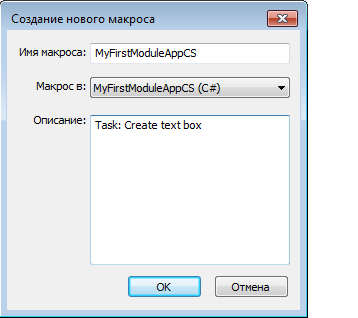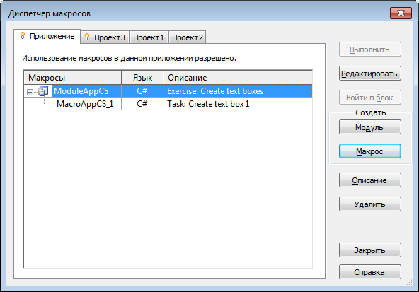 - запущен метод новой макрокоманды (в примере на приведенном выше рисунке — MyFirstMacrosApp), для которого в круглых скобках можно вставить код, относящийся к конкретной реализации.