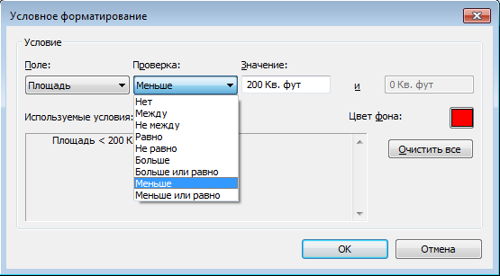 К примерам применения параметра "Условное форматирование" относится настройка условия для указания того, что площадь имеет значение в квадратных футах ниже заданного минимума, или того, правильное ли количество воздуха подается в каждое из помещений в модели.