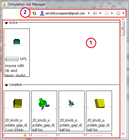 The toolbar is used to set up and customize the Simulation Job Manager. You can change from thumbnail view to list view to see additional job details, sort the jobs according to a variety of characteristics, or change the location of your temporary file transfer folder
