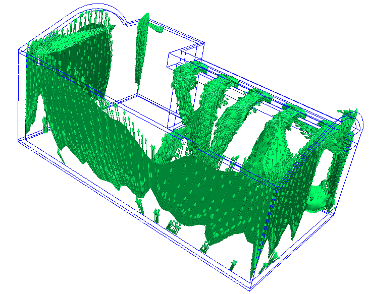 Iso surfaces are a three dimensional visualization tool that show a value as well as the physical shape of the flow characteristics. They are useful for visualizing velocity distributions in complicated flow paths as well as temperature distributions in thermal simulations. You can also use iso surfaces to determine the locations of the maximum and minimum values of a quantity.