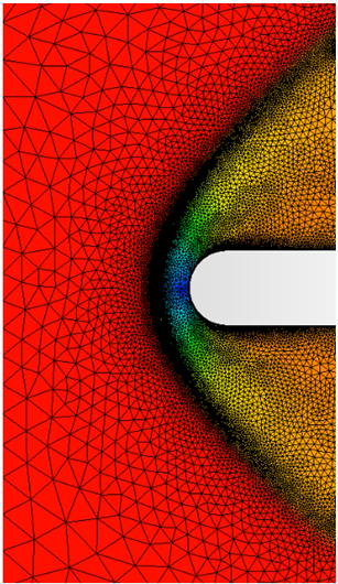 To focus the mesh on the location and gradients across shock waves in compressible flow, enable the Shocks option. In the following image, we can see the shock formation upstream of the object, but because the Shocks option was disabled, the mesh was not adapted to the shock, and the gradients are diffuse: