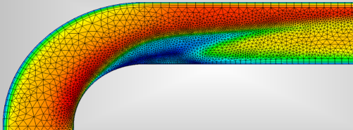 Enable Free Shear Layers if you suspect that such strong velocity gradients will occur within your flow. In the following flow in a bend, a flow separation region occurs at the inside radius of the pipe and the free stream flow core is pushed to the outside radius.