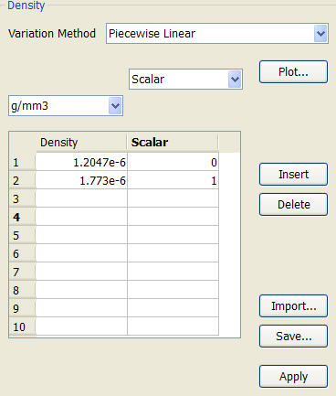 A single material is defined within the flow region, and is defined so that its properties depend on the scalar condition. For example, a piece-wise linear variation for density as a function of scalar will cause the density to vary based on the relative concentration of the two fluids. The other properties, viscosity, conductivity, etc., can be varied in the same way.