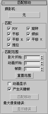 设置将要匹配的帧的范围,以此来建立电影帧和 3ds Max 场景动画帧间的关系。默认情况下,开始帧都设置为 0,而帧数设置为电影或场景动画中较小的帧数。通过设置不同的“电影起点”或“动画起点”帧,可以相对于动画帧范围来放置电影帧范围。用于匹配的位置数据从“影片开始”微调器值开始取自于跟踪器帧,而摄影机也从这些帧开始匹配和设置动画。