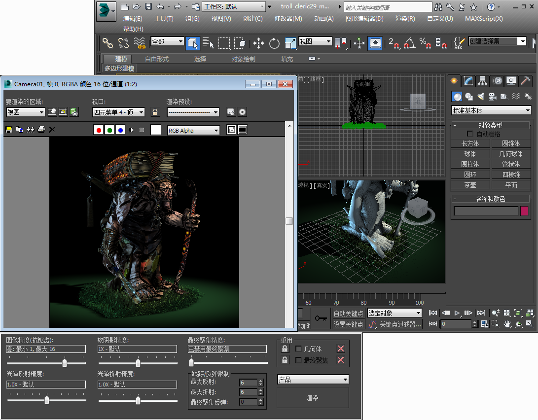 3ds Max 主窗口,带有停靠工具栏和显示多个视图的视口布局。