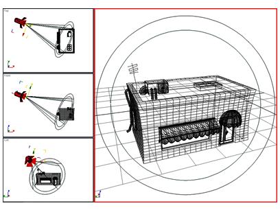 摄影机视口会通过选定的摄影机镜头来跟踪视图。在其他视口中移动摄影机(或目标)时,您会看到场景也会随着移动。这就是“摄影机”视图较之“透视”视图的优势,因为“透视”视图无法随时间设置动画。
