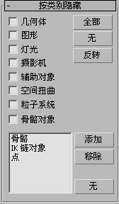 “按类别隐藏”卷展栏通过类别(对象、摄影机、灯光等)切换对象显示。