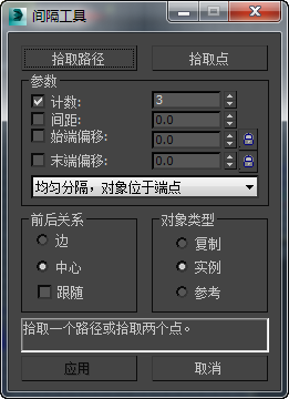 - 在“间隔工具”对话框中,单击“拾取路径”或“拾取点”来指定路径。
