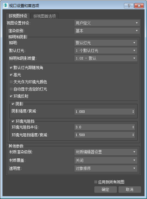 - 启用时,两个默认灯光将跟踪视口位置的变化。(一个默认灯光始终跟踪视口位置)。