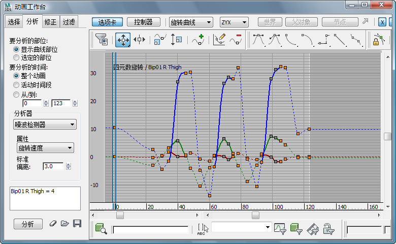 这些工具用来查找动画中的一般属性。一些分析器用来解析运动轨迹的波形以及检测曲线变化。可以使用两种检测器来执行此操作:噪波和刺波检测器。还可以使用一些分析器来查找和修复膝部条件,尤其是膝部摆动和扩展。
