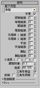 当体形模式处于活动状态时,“结构”卷展栏将变为可用状态。该卷展栏包含用于更改 Biped 的骨骼结构以匹配角色网格(恐龙、机器人和人类等)的参数。也可以添加小道具(最多可以添加三个)来表示工具或武器。