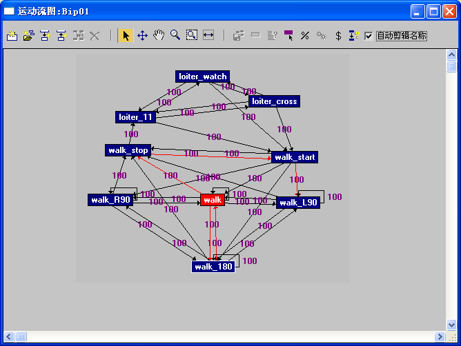 在“运动流”模式下,第一步是在“运动流图”中添加剪辑,以供在脚本中使用。剪辑代表所有或部分 BIP 文件。脚本表示经过“运动流图”中剪辑的不同路径。当前脚本中的第一个剪辑以红色显示。变换以两个剪辑之间的箭头显示,红色箭头表示经过活动脚本的路径。黑色变换箭头表示已卸载的脚本。循环回相同剪辑的变换代表的是一个循环。