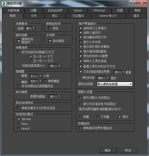 相关的选项。这些选项包括在线框视口中显示的已设置动画的对象、声音插件的指定和控制器默认值。