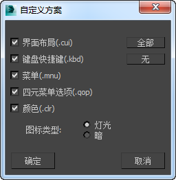 输入基本文件名并单击“保存”之后,将显示“自定义方案”对话框。在“自定义方案”对话框上,可以设置要保存的用户界面方案的类型。文件将被保存为所选的各类方案,每个类型都具有该类方案的特定扩展名。使用“加载自定义 UI 方案”对话框加载任意一个自定义 UI 方案文件时,将同时加载具有相同基本文件名的整个文件集。