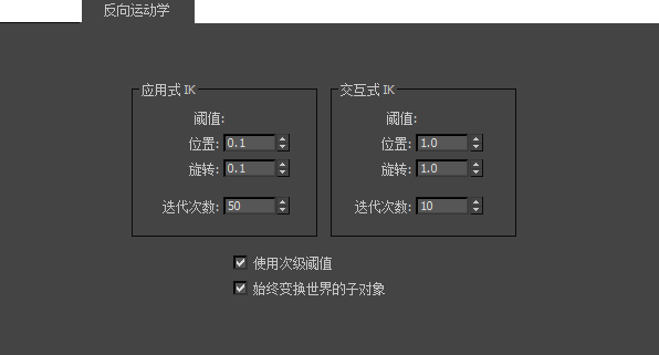 阈值和迭代设置在精度和速度之间平衡。使用这两个组设置,可以单独调节交互式 IK 和应用式 IK 的行为。交互式 IK 提供快速实时的响应,因此应该为速度设置交互式 IK 首选项。应用式 IK 提供IK 解决方案来匹配跟随对象。应该精度设置应用式 IK 首选项。