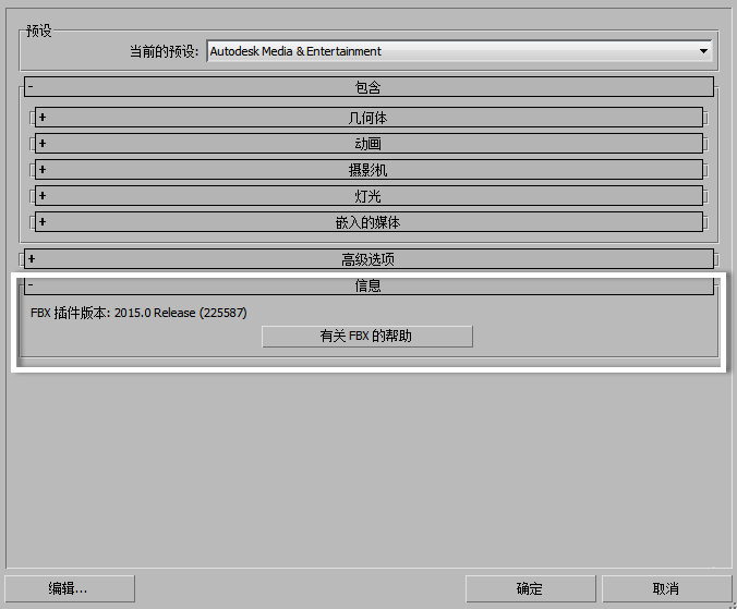 “信息”卷展栏包含有关 3ds Max FBX plug-in的数据以及可用于访问 3ds Max FBX plug-in帮助的按钮。