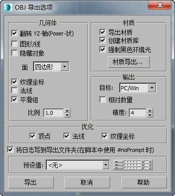 如果启用“使用材质”但禁用“创建材质库”,则 OBJ 文件包含对类似名称为 MTL 的参考,但不保存 MTL 文件。如果 MTL 文件已经存在,则使用此功能保存时间。