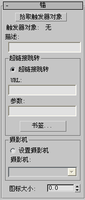 使用“锚定”辅助对象可以指定场景中的单击播放触发器。该触发器将链接到场景中当前现有的对象上。从而可以向其他 HTML 页面、VRML97 世界添加链接,或替代 VRML97 世界中的摄影机。