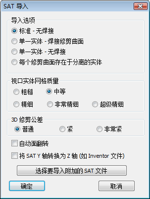 注: SAT 文件的大小可能非常大。如果导入 SAT 文件时遇到问题,请在导入前将显示设置为单个线框视口并将“视口实体网格质量”设置为“粗糙”。同样,要导入大于 100MB 的 SAT 文件,强烈建议使用 64 位版本的 3ds Max