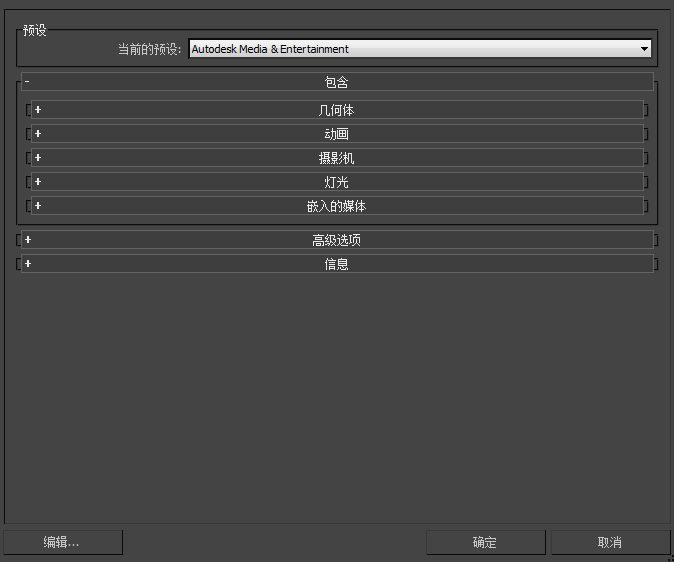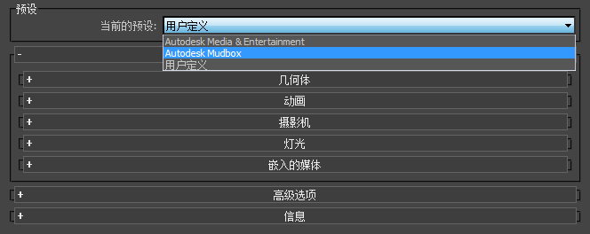 “Autodesk Media and Entertainment”是“3ds Max 导出器”的默认预设。