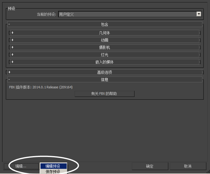 通过“FBX 导出器 UI”中的 “编辑”按钮访问“编辑/保存预设”选项。