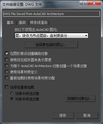 当链接或重新加载 AutoCAD 图形时,“文件链接设置: DWG 文件”对话框的“高级”面板控制 3ds Max 如何导出 AutoCAD 基本体,并决定 3ds Max 是否使用场景材质定义。它也可以用于有选择性地重新加载场景,以便只重新加载特定对象,而不重新加载整个文件。