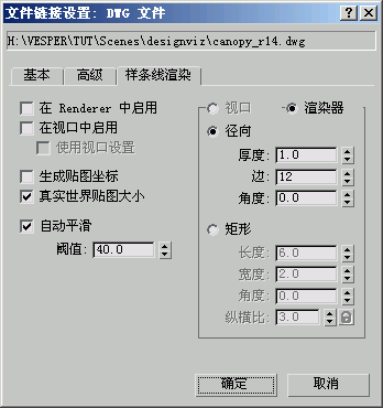 “导入选项”对话框的“样条线渲染”面板用于确定从 DWG 和 DXF 文件导入的样条线对象在视口中的显示方式以及 3ds Max 渲染器处理它们的方式。