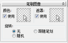 启用“使用”时,“视口画布”使用指定的笔刷图像遮盖笔刷;即,隐藏和显示笔刷图像的不同部分。换句话说,遮罩图像基于遮罩图像中每像素的亮度设置不透明度。白色区域完全不透明(应用下层笔刷图像的全部颜色);黑色区域完全透明(不应用绘制),灰色区域使用前二者之间的透明度。