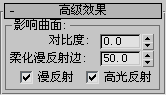 - 调整曲面的漫反射区域和环境光区域之间的对比度。普通对比度设置为 0。增加该值即可增加特殊效果的对比度:例如,外部空间刺眼的光。默认设置是 0.0。