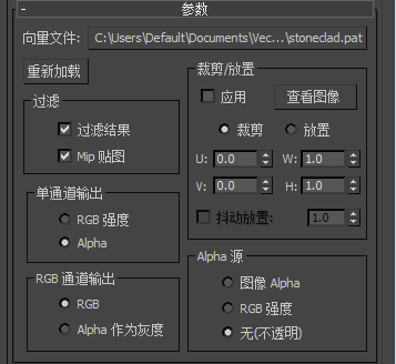某些参数(如不透明度或高光级别)相对材质的三值颜色分量来说是单个值。此组中的控件根据输入的向量文件确定输出单色通道的源。