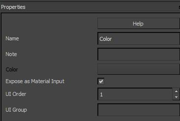 - 将“名称”字段更改为 MyColor,将“UI 顺序编号”更改为 1,并启用“显示为材质输入”。