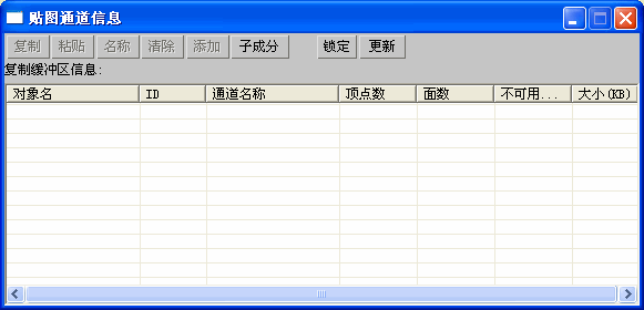 该工具的“贴图通道信息”对话框显示选中对象的所有通道数据。其中显示通道数、每个通道的顶点数以及通道使用的内存数量。使用该对话框还可以命名通道以及清除(或删除)、复制和粘贴通道。除重命名以外,以上每个操作都要在堆栈上放一个修改器,才能达到效果。