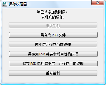- 另存为 PSD 并替换材质中的纹理 以 PSD 格式保存图像并使用保存的 PSD 文件替换材质中的当前贴图。此选项可保留贴图中的层。