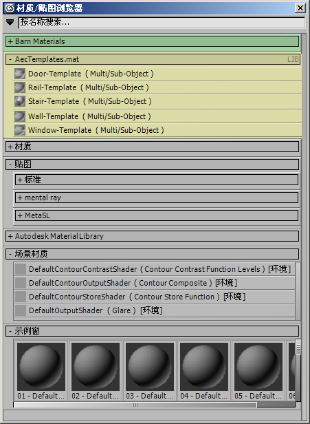 多数“材质/贴图浏览器”界面只是按库和组进行组织的材质、贴图和控制器的列表。每个库和组都有一个带有打开/关闭 (+/-) 图标的标题栏,该图标可用于展开或收缩列表。组可以有子组,子组有自己的标题栏,某些子组可以有更深层的子组。