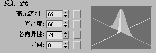 影响反射高光的强度。随着该值的增大,高光将越来越亮。对于标准材质,默认设置为 0;对于光线跟踪材质,默认设置为 50。