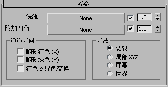 默认情况下,法线贴图的红色通道表示向左(较大值)与向右(较小值),而绿色通道表示向下(较大值)与向上(较小值),蓝色通道表示垂直距离。使用该组中的控件可以调整解释。