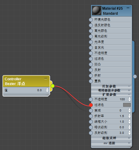 关联节点时,如果您所选择的输入套接字与要关联的输出不匹配,3ds Max 会将套接字显示为红色,同时不会完成关联操作。贴图也会出现这种现象,但控制器出现的更多。例如,在例图中,控制器生成的是一个标量值,因此您无法用它来控制颜色等三值的设置。