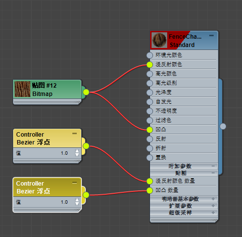 对标准材质的组件进行贴图时,“Slate 材质编辑器”会自动添加相应的控制器节点。例如,如果将某个位图关联到材质的漫反射颜色组件,漫反射颜色量参数的 Bezier 浮点控制器也会显示。要查看这些控制器,则需要显示其他参数(右键单击材质节点,然后选择“显示所有其他参数”)。