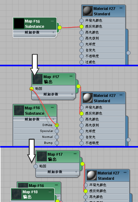 底部:在 Substance 贴图和材质之间建立另一个连接(高光反射)后插入的另一个“贴图输出选择器”。