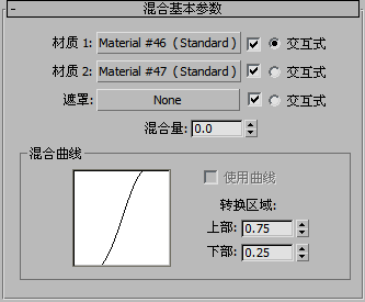 贴图指定给“遮罩”参数时,“混合量”设置不可用。如果禁用“使用曲线”,将按原样使用混合贴图。启用“使用曲线”时,可以使用混合曲线移动遮罩贴图的渐变坡度效果,使其中的某个材质显示得更多,或使另一个显示得更少。