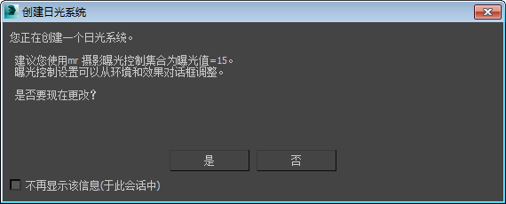 无论使用哪一种方法,如果添加日光系统并且当前没有有效的曝光控制方法,3ds Max 将自动提示应用适当的曝光控制。始终使用最适合当前渲染器的曝光控制: