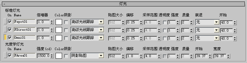 - 选定灯光“灯光”卷展栏仅显示选定的灯光。